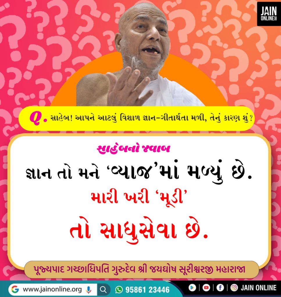 આટલું વિશાળ જ્ઞાન-ગીતાર્થતા મળી Q. સાહેબ! આપને આટલું વિશાળ જ્ઞાન-ગીતાર્થતા મળી, તેનું કારણ શું? A. જ્ઞાન તો મને વ્યાજ માં મળ્યું છે. મારી ખરી મૂડી તો સાધુસેવા છે. Tags: Life Changing Quotes Share Post Twitter Facebook Pinterest Mail to friend Linkedin Whatsapp પાપો છૂટે શી રીતે? Amidrishti – The Divine ... Related posts Read more વૈરાગ્યની બક્ષિસ Q. વૈરાગ્યની બક્ષિસ શું? A. ભૌતિક સુખમાં વધારે સાવધાની અને... Continue reading Read more વૈરાગ્યજનક શાસ્ત્રો Q. વૈરાગ્યજનક શાસ્ત્રોનું ફળ શું? A. વૈરાગ્યશતક ગ્રન્થનો જો સંળગ... Continue reading Read more સંસાર Q.સંસાર એટલે શું? A. સંસાર એટલે આત્મસ્વરૂપમાં 👉 બધું વિકૃત... Continue reading Read more શુભ સંસ્કાર Q. શુભ સંસ્કાર શેનાથી પડે? A. ઉપયોગ આદરપૂર્વક અર્થ સ્વાધ્યાય... Continue reading Read more સંસારની પ્રવૃતિઓ Q. સંસારની પ્રવૃતિઓમાંથી રસ ઘટાડવાનો ઉપાય શું? A. જીવે અંનતકાળ... Continue reading