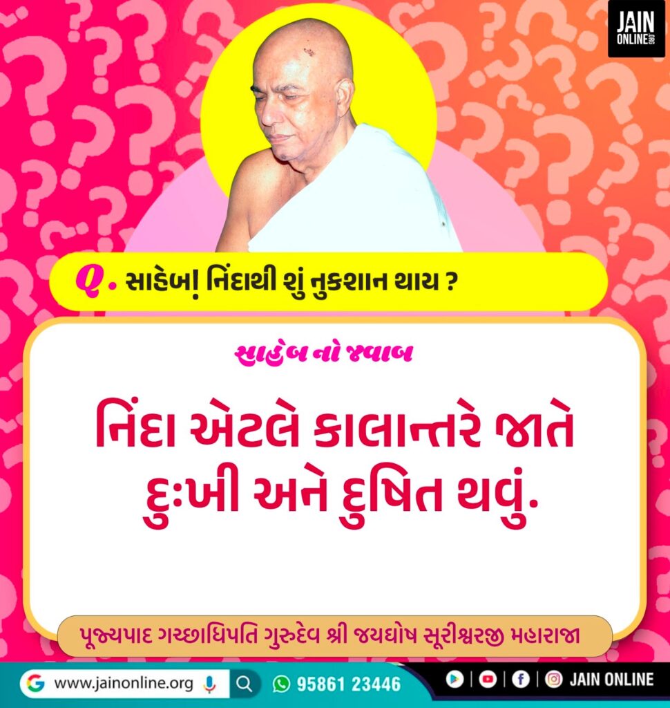નિંદાથી શું નુકશાન થાય ? Q. સાહેબ! નિંદાથી શું નુકશાન થાય ? A. નિંદા એટલે કાલાન્તરે જાતે દુઃખી અને દુષિત થવું Tags: Jaygosh Suri Maharaja, Life Changing Quotes Share Post Twitter Facebook Pinterest Mail to friend Linkedin Whatsapp Faith Personified વિદ્વાનની સચોટ વ્યાખ્યા શું? Related posts Read more વૈરાગ્યની બક્ષિસ Q. વૈરાગ્યની બક્ષિસ શું? A. ભૌતિક સુખમાં વધારે સાવધાની અને... Continue reading Read more વૈરાગ્યજનક શાસ્ત્રો Q. વૈરાગ્યજનક શાસ્ત્રોનું ફળ શું? A. વૈરાગ્યશતક ગ્રન્થનો જો સંળગ... Continue reading Read more સંસાર Q.સંસાર એટલે શું? A. સંસાર એટલે આત્મસ્વરૂપમાં 👉 બધું વિકૃત... Continue reading Read more શુભ સંસ્કાર Q. શુભ સંસ્કાર શેનાથી પડે? A. ઉપયોગ આદરપૂર્વક અર્થ સ્વાધ્યાય... Continue reading Read more સંસારની પ્રવૃતિઓ Q. સંસારની પ્રવૃતિઓમાંથી રસ ઘટાડવાનો ઉપાય શું? A. જીવે અંનતકાળ... Continue reading