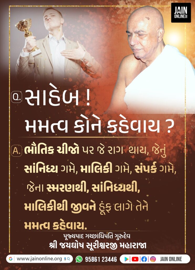 મમત્વ કોને કહેવાય ? Q. સાહેબ ! મમત્વ કોને કહેવાય ? A. ભૌતિકચીજો પર જે રાગ થાય, જેનું સાનિધ્ય ગમે, માલિકી ગમે, સંપર્ક ગમે, જેના સ્મરણથી સાનિધ્યથી, માલિકીથી જીવને હૂંફ લાગે તેને મમત્વ કહે વાય. Tags: Jaygosh Suri Maharaja, Life Changing Quotes, Siddhant Divakar Share Post Twitter Facebook Pinterest Mail to friend Linkedin Whatsapp હિત એટલે શું ? રીંગણા આકાર ને લીધે Related posts Read more વૈરાગ્યની બક્ષિસ Q. વૈરાગ્યની બક્ષિસ શું? A. ભૌતિક સુખમાં વધારે સાવધાની અને... Continue reading Read more વૈરાગ્યજનક શાસ્ત્રો Q. વૈરાગ્યજનક શાસ્ત્રોનું ફળ શું? A. વૈરાગ્યશતક ગ્રન્થનો જો સંળગ... Continue reading Read more સંસાર Q.સંસાર એટલે શું? A. સંસાર એટલે આત્મસ્વરૂપમાં 👉 બધું વિકૃત... Continue reading Read more શુભ સંસ્કાર Q. શુભ સંસ્કાર શેનાથી પડે? A. ઉપયોગ આદરપૂર્વક અર્થ સ્વાધ્યાય... Continue reading Read more સંસારની પ્રવૃતિઓ Q. સંસારની પ્રવૃતિઓમાંથી રસ ઘટાડવાનો ઉપાય શું? A. જીવે અંનતકાળ... Continue reading