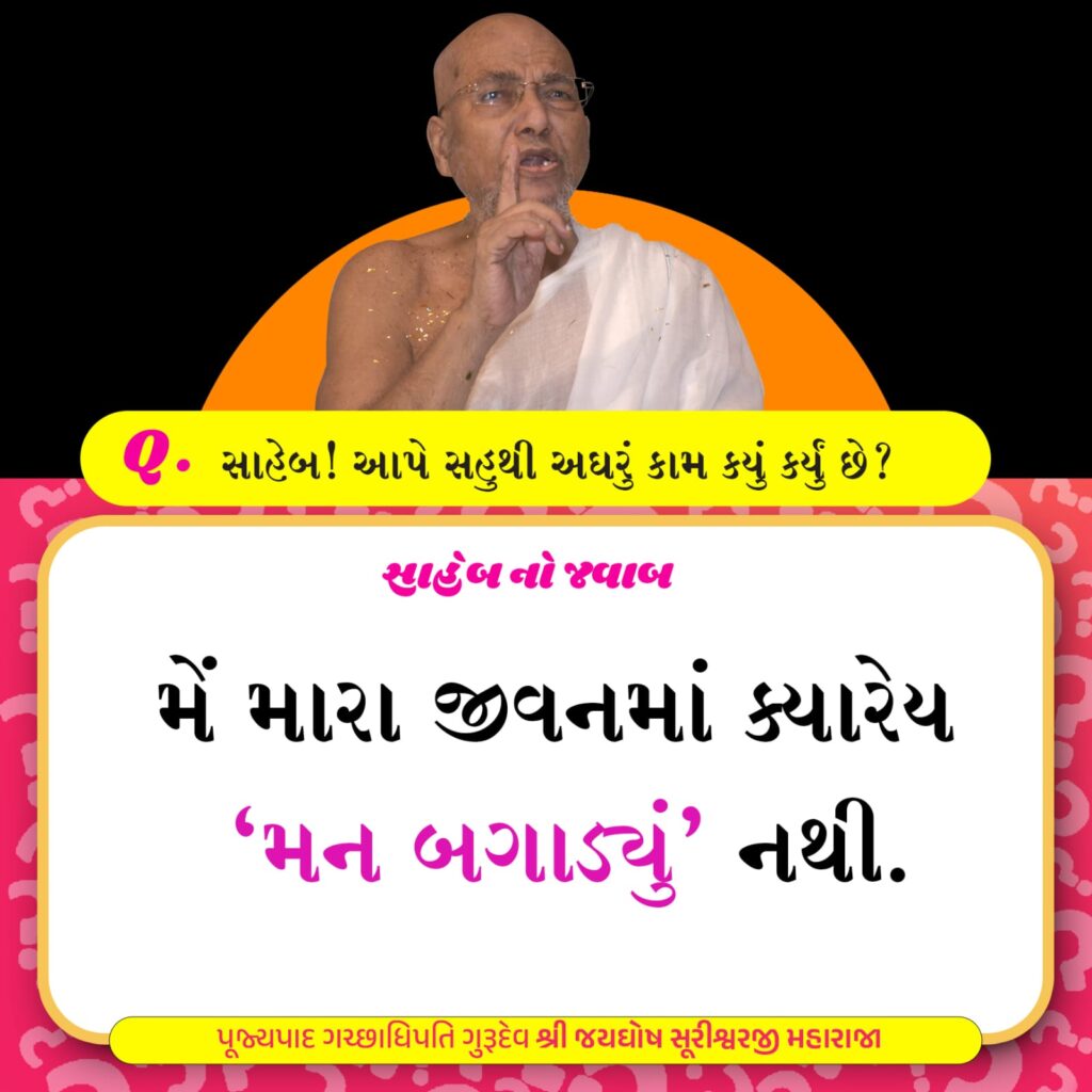 Q. આપે સહુથી અઘરું કામ ક્યુ કર્યું છે? A. મેં મારા જીવનમાં ક્યારેય ‘મન બગાડયું નથી. Tags: Jaygosh Suri Maharaja, Life Changing Quotes Share Post Twitter Facebook Pinterest Mail to friend Linkedin Whatsapp સમ્યક્ત્વ પ્રસન્નતા Related posts Read more વૈરાગ્યની બક્ષિસ Q. વૈરાગ્યની બક્ષિસ શું? A. ભૌતિક સુખમાં વધારે સાવધાની અને... Continue reading Read more વૈરાગ્યજનક શાસ્ત્રો Q. વૈરાગ્યજનક શાસ્ત્રોનું ફળ શું? A. વૈરાગ્યશતક ગ્રન્થનો જો સંળગ... Continue reading Read more સંસાર Q.સંસાર એટલે શું? A. સંસાર એટલે આત્મસ્વરૂપમાં 👉 બધું વિકૃત... Continue reading Read more શુભ સંસ્કાર Q. શુભ સંસ્કાર શેનાથી પડે? A. ઉપયોગ આદરપૂર્વક અર્થ સ્વાધ્યાય... Continue reading Read more સંસારની પ્રવૃતિઓ Q. સંસારની પ્રવૃતિઓમાંથી રસ ઘટાડવાનો ઉપાય શું? A. જીવે અંનતકાળ... Continue reading