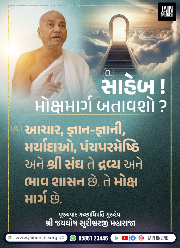 Q.મોક્ષમાર્ગ બતાવશો? A.આચાર,જ્ઞાન-જ્ઞાની,મર્યાદાઓ,પંચપરમેષ્ઠિ અને સંઘ તે દ્રવ્ય અને ભાવ શાસન છે.તે મોક્ષમાર્ગ છે. Tags: Jaygosh Suri Maharaja, Life Changing Quotes Share Post Twitter Facebook Pinterest Mail to friend Linkedin Whatsapp પ્રસન્નતા ધર્મ Related posts Read more વૈરાગ્યની બક્ષિસ Q. વૈરાગ્યની બક્ષિસ શું? A. ભૌતિક સુખમાં વધારે સાવધાની અને... Continue reading Read more વૈરાગ્યજનક શાસ્ત્રો Q. વૈરાગ્યજનક શાસ્ત્રોનું ફળ શું? A. વૈરાગ્યશતક ગ્રન્થનો જો સંળગ... Continue reading Read more સંસાર Q.સંસાર એટલે શું? A. સંસાર એટલે આત્મસ્વરૂપમાં 👉 બધું વિકૃત... Continue reading Read more શુભ સંસ્કાર Q. શુભ સંસ્કાર શેનાથી પડે? A. ઉપયોગ આદરપૂર્વક અર્થ સ્વાધ્યાય... Continue reading Read more સંસારની પ્રવૃતિઓ Q. સંસારની પ્રવૃતિઓમાંથી રસ ઘટાડવાનો ઉપાય શું? A. જીવે અંનતકાળ... Continue reading