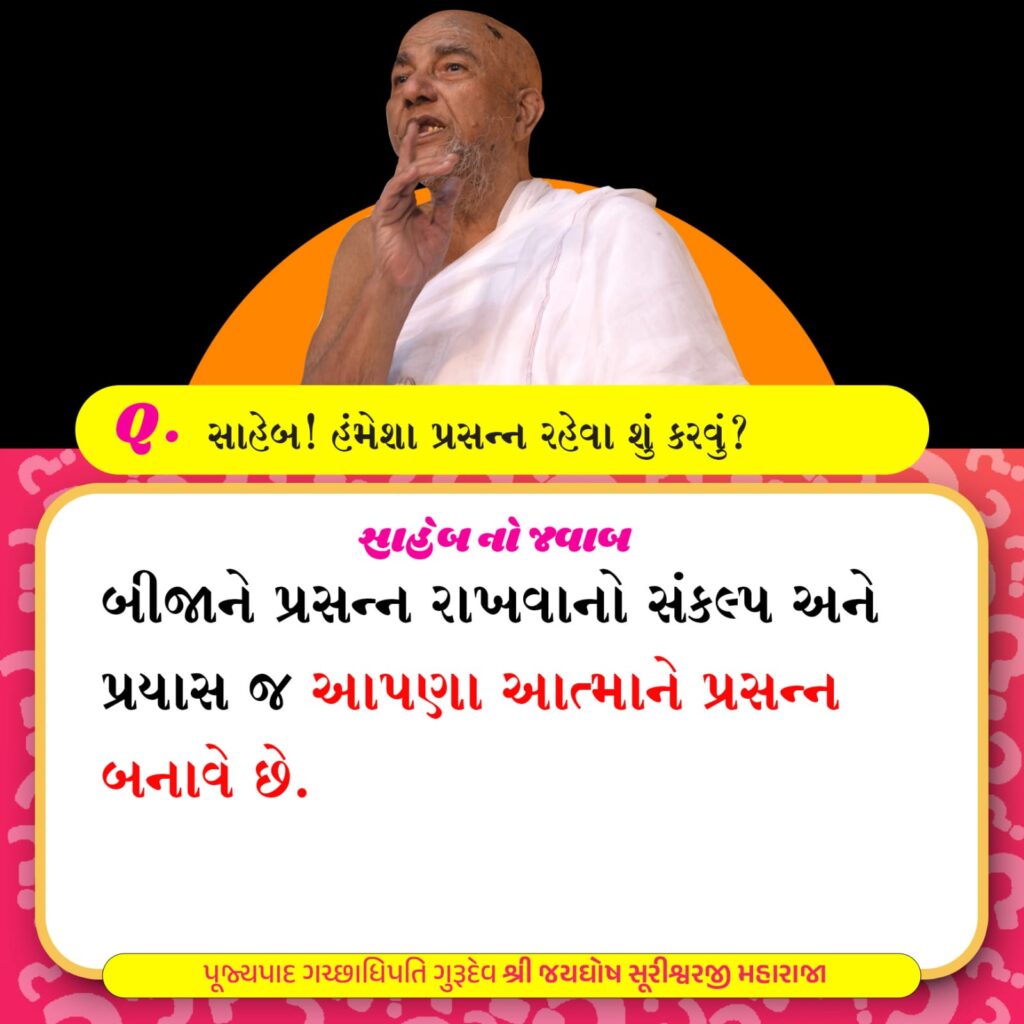 Q. હંમેશા પ્રસન્ન રહેવા શું કરવું? A. બીજાને પ્રસન્ન રાખવાનો સંકલ્પ અને પ્રયાસ જ આપણા આત્માને પ્રસન્ન બનાવે છે. Tags: Jaygosh Suri Maharaja, Life Changing Quotes Share Post Twitter Facebook Pinterest Mail to friend Linkedin Whatsapp મન મોક્ષમાર્ગ Related posts Read more વૈરાગ્યની બક્ષિસ Q. વૈરાગ્યની બક્ષિસ શું? A. ભૌતિક સુખમાં વધારે સાવધાની અને... Continue reading Read more વૈરાગ્યજનક શાસ્ત્રો Q. વૈરાગ્યજનક શાસ્ત્રોનું ફળ શું? A. વૈરાગ્યશતક ગ્રન્થનો જો સંળગ... Continue reading Read more સંસાર Q.સંસાર એટલે શું? A. સંસાર એટલે આત્મસ્વરૂપમાં 👉 બધું વિકૃત... Continue reading Read more શુભ સંસ્કાર Q. શુભ સંસ્કાર શેનાથી પડે? A. ઉપયોગ આદરપૂર્વક અર્થ સ્વાધ્યાય... Continue reading Read more સંસારની પ્રવૃતિઓ Q. સંસારની પ્રવૃતિઓમાંથી રસ ઘટાડવાનો ઉપાય શું? A. જીવે અંનતકાળ... Continue reading