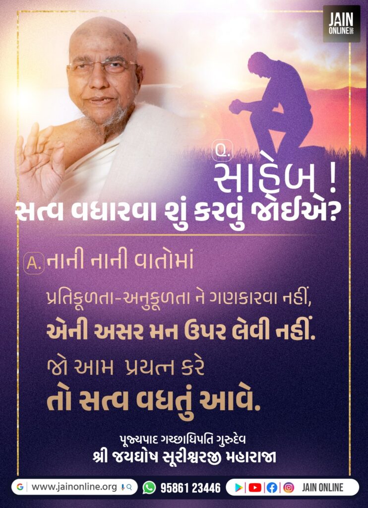 A. નાની નાની વાતોમાં પ્રતિકૂળતા -અનુકૂળતાને ગણકારવા નહીં,એની અસર મન ઉપર લેવી નહીં.જો આમ પ્રયત્ન કરે તો સત્વ વધતું આવે.
