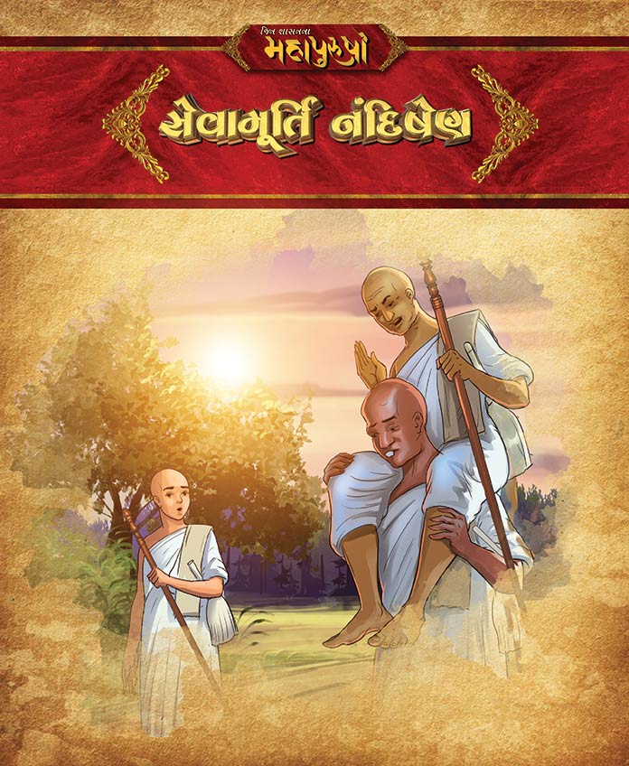 “This Jainism Children story book contains the story of Sevamurti Nandishen.” It gives details of how the Muni passed the test of Deva and continued the Vaiyavach of a Sadhu mahatma.